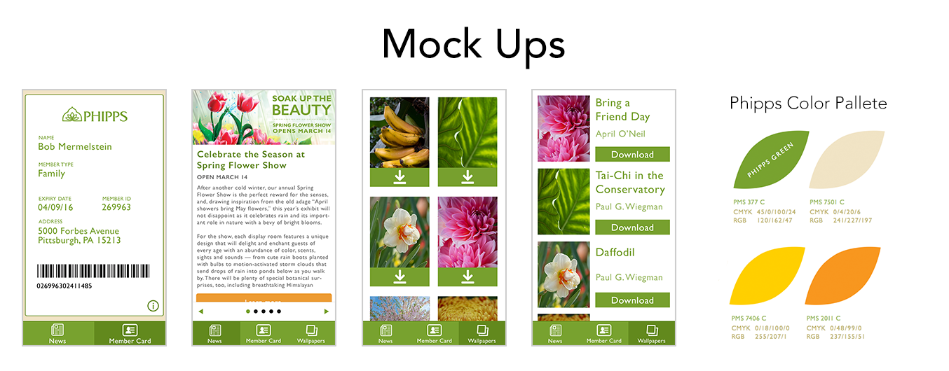 I designed hi-fidelity mockups next. To keep the application’s aesthetics in line with the Phipps Conservatory brand, I worked closely with the director of marketing and with the organizational style guide. The biggest design takeaway was that the application needed to be designed for the older audience of conservatory members. To adjust I made decisions like use explanatory text instead of iconography, and larger text and button sizes.