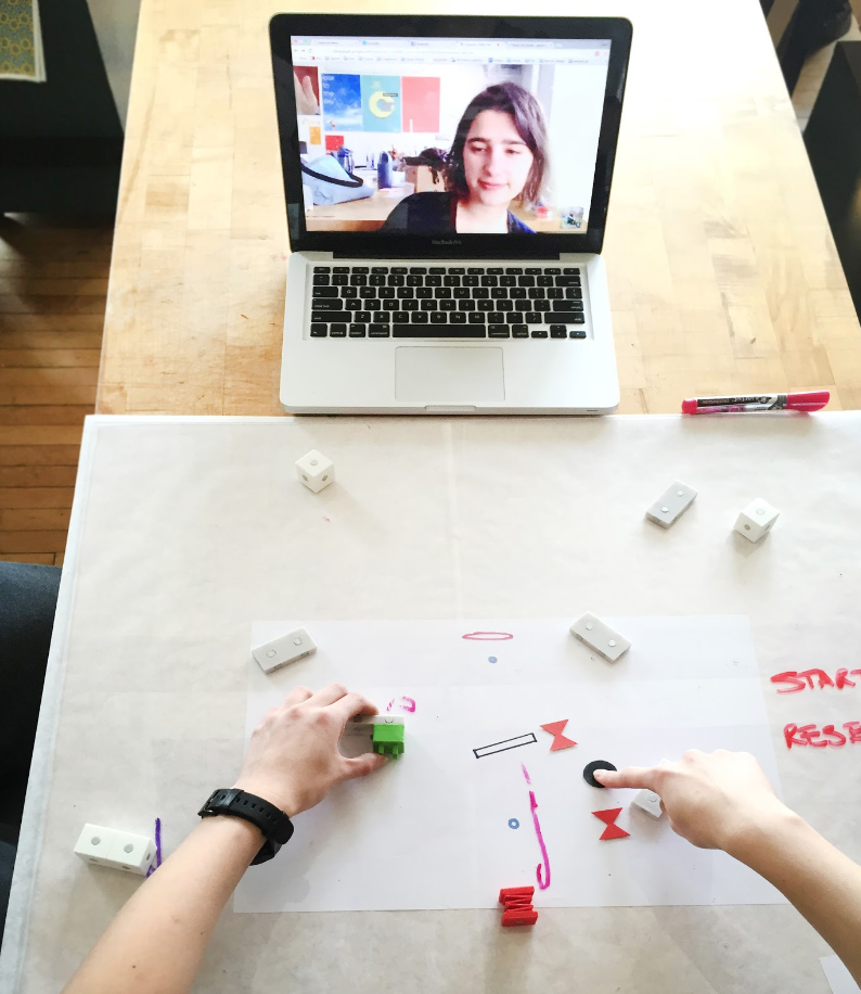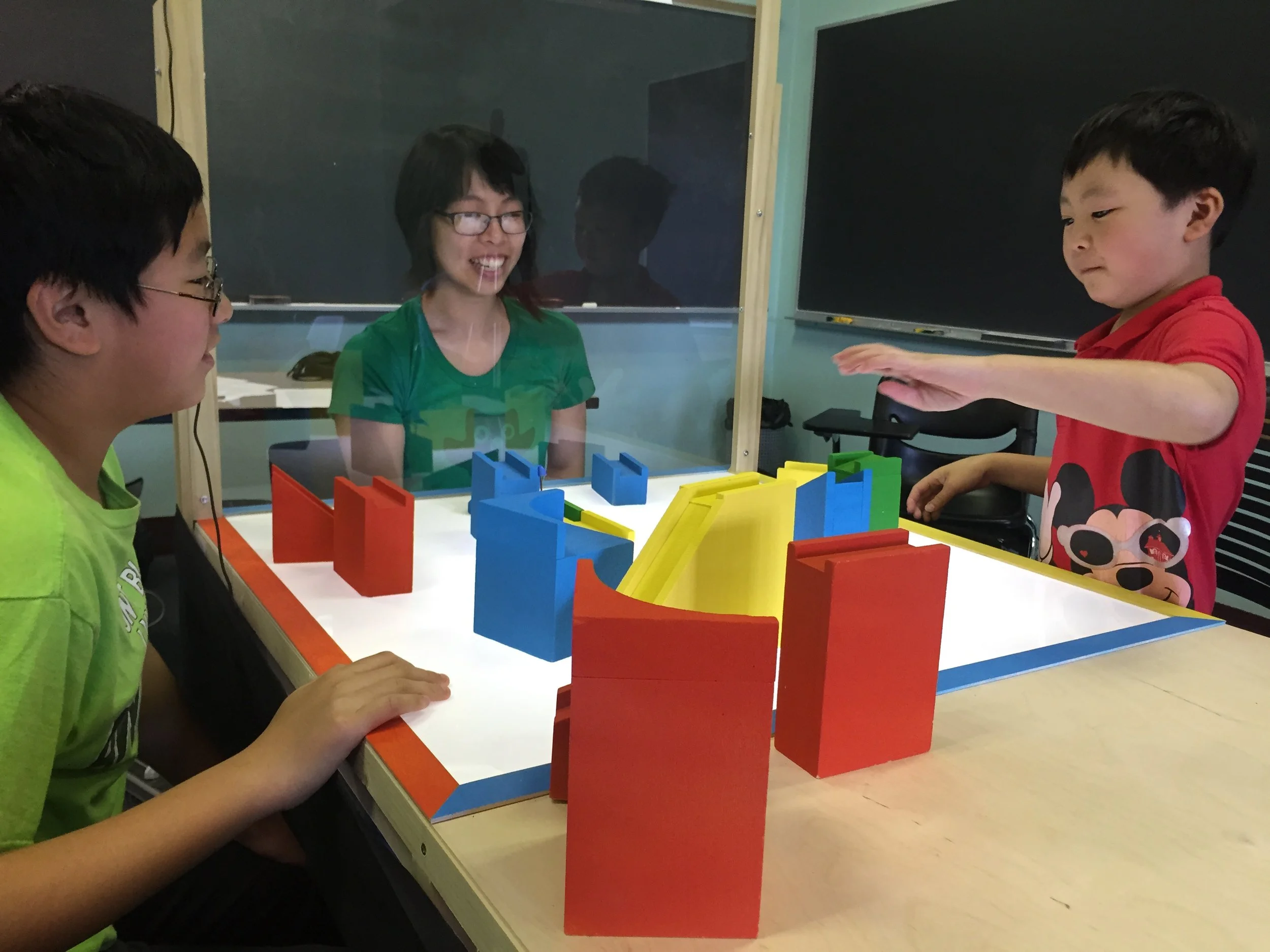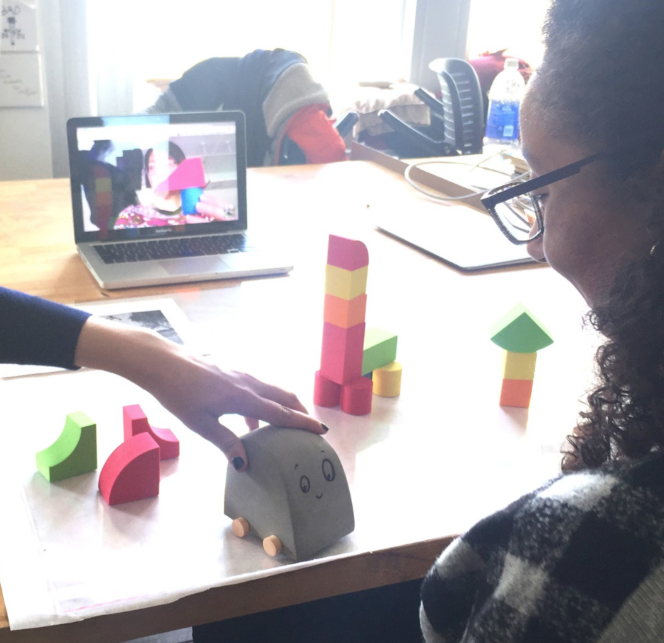 Our lo-fi prototypes were used to test different activities and modes of interaction. We wanted to see how these different prototypes would affect collaboration, engagement, and curiosity. We simulated the possibility of the virtual agent interacting through a smart surface and through the means of a proxy (we named it Beep Boop)